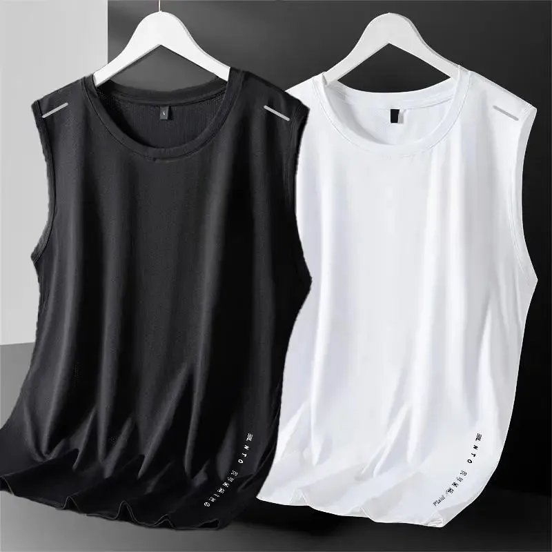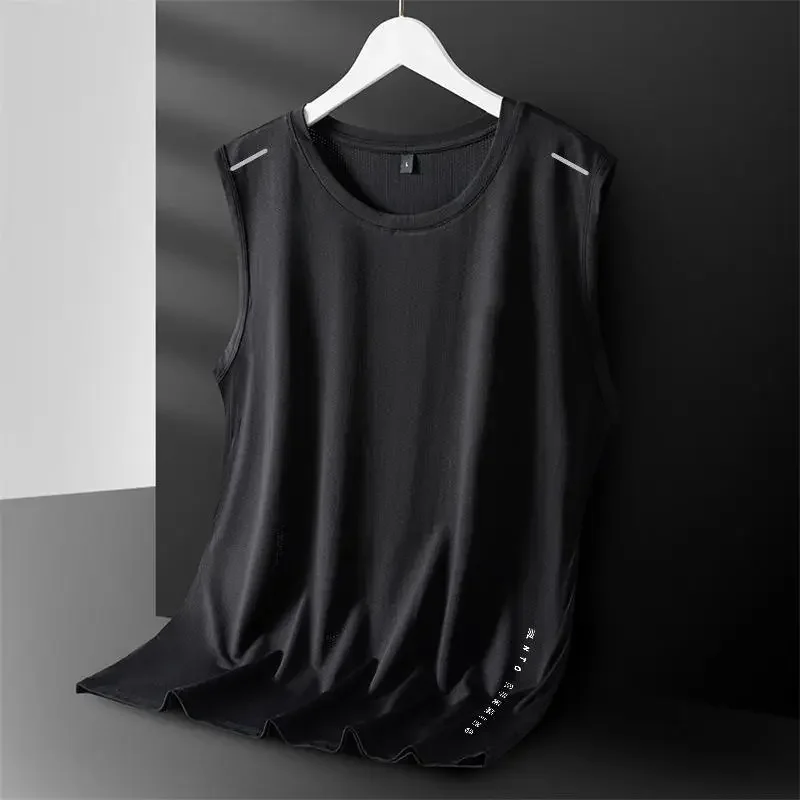 Colete masculino de seda gelada com gola redonda, malha respirável, secagem rápida, esportivo, ombro largo, roupa externa sem mangas, moda verão