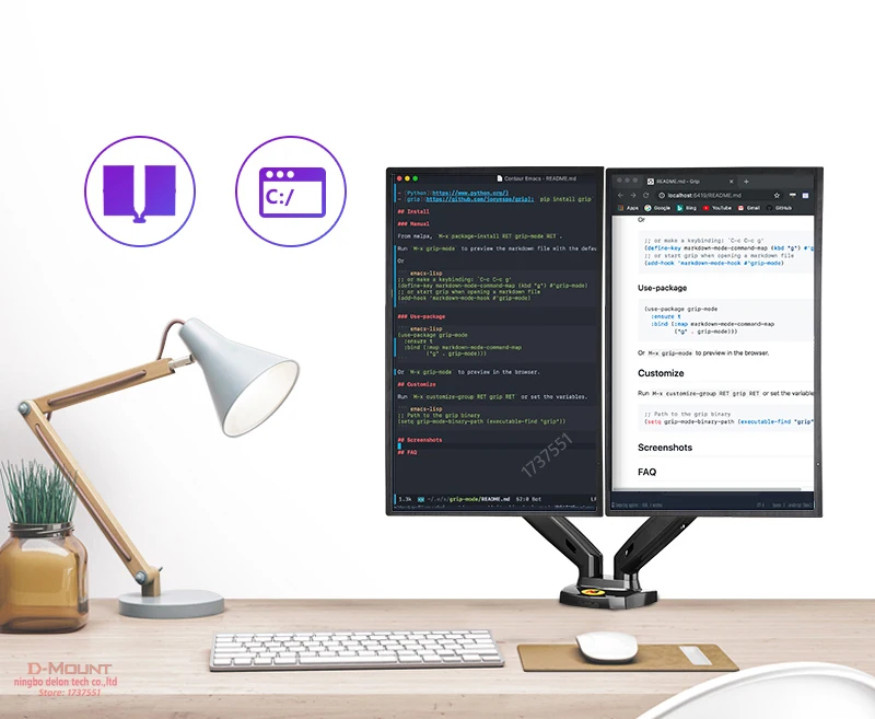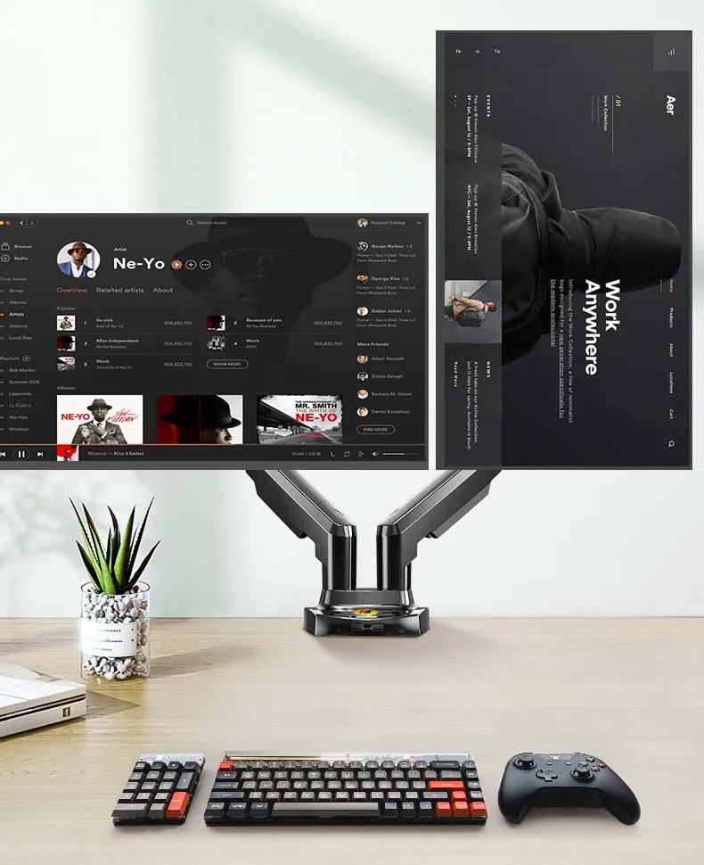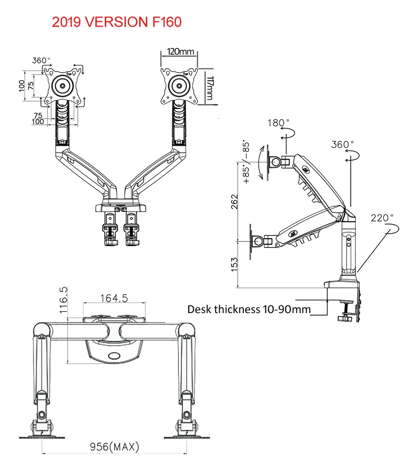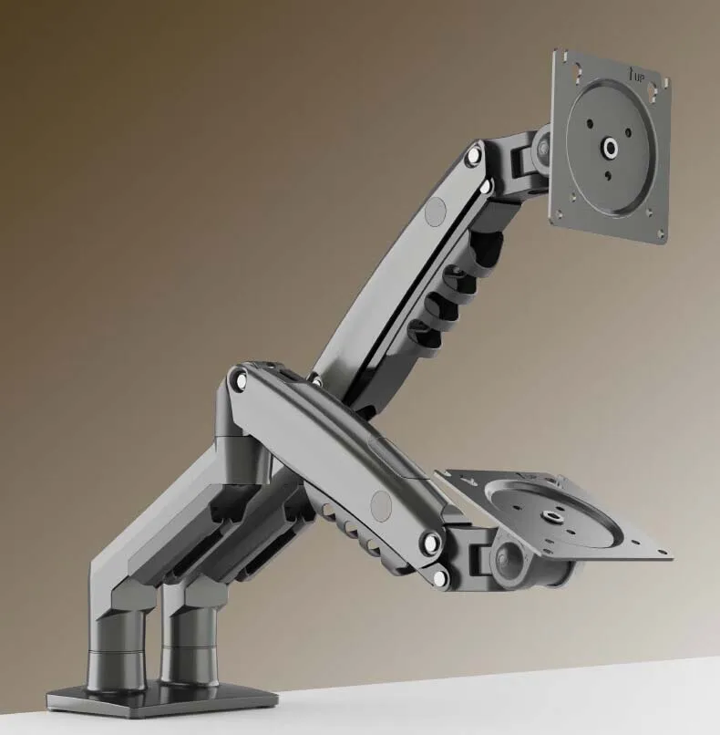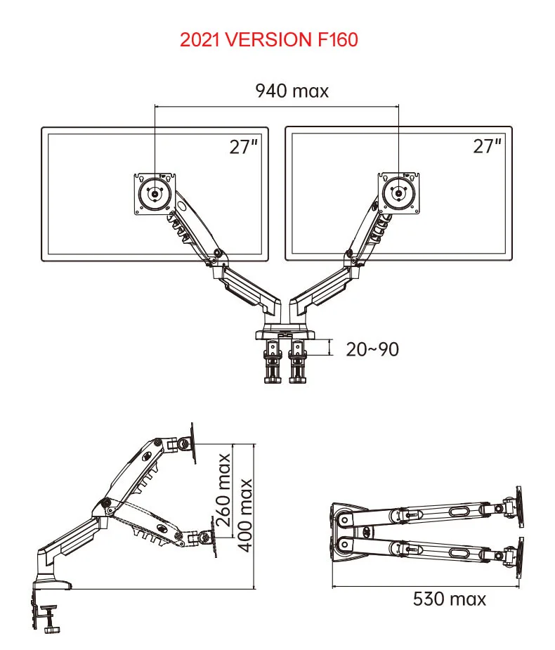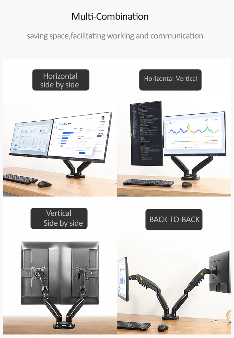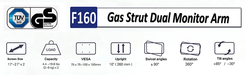 O suporte flexível para monitor de tela dupla de mesa F160 é um cilindro de vérte a gás durável integrado para permitir que suas telas sejam movidas em qualquer direção e altura conforme desejar.Permite que você experimente o melhor design de interface ecológica para obter a melhor posição de visualização.Suporte LCD de mesa com telas duplas F160 projetado especialmente para pessoas que precisam de múltiplas telas e multitarefas para aprimorar sua produtividade em trabalhos de escritório, finanças, design e TI.Adicionado aquele design da junta articulada com mola por gravidade ofereceu uma posição de inclinação sem esforço para eliminar o ângulo de visão cinza.