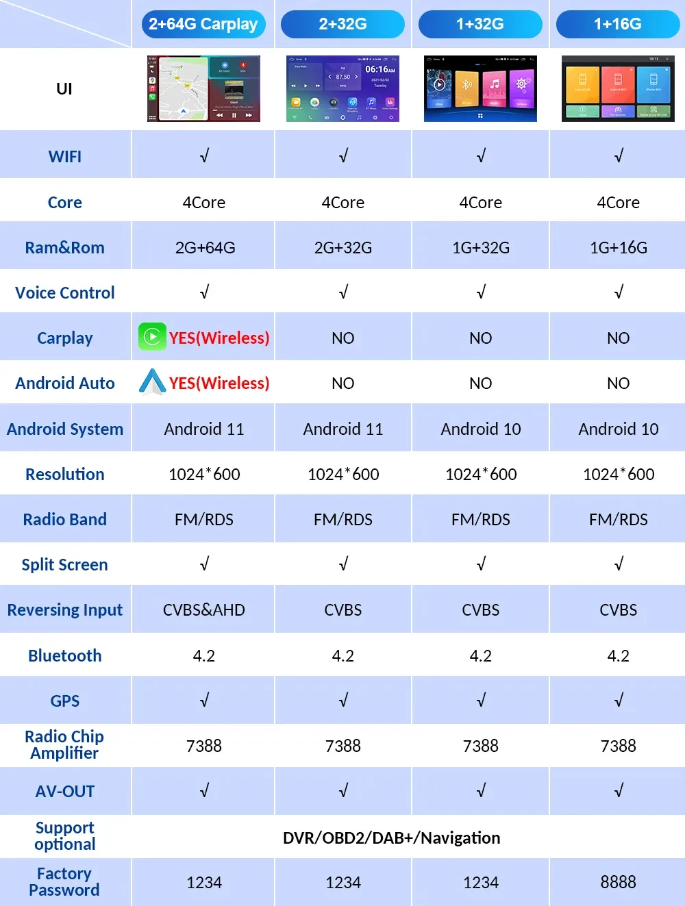 Memory: 1+16G/1+32G/2+32G/2+64G Carplay